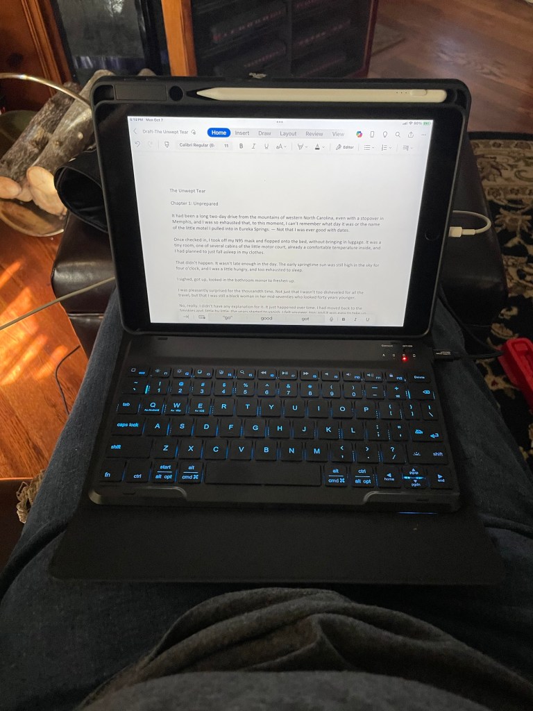 Chapter 9 is finally written! Progress on Book Four, “The Unwept Tear,” followed a veggie burger lunch at Mud Street Cafe, a visit to my new doctor’s office and then viewing the 98.8% totality eclipse in his parking lot with his employees.