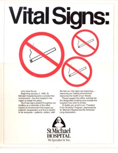 This newspaper ad was reprinted on index stock for posting inside the hospital before and during the implementation of their no-smoking policy. The hospital is now known as “Christus St Michael,” and the logo has changed.