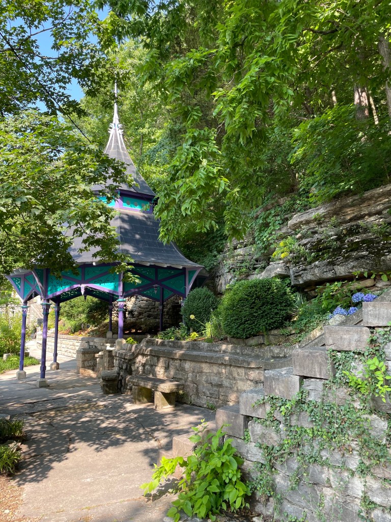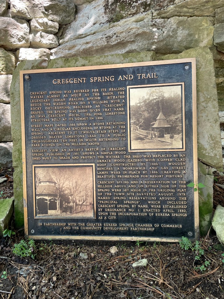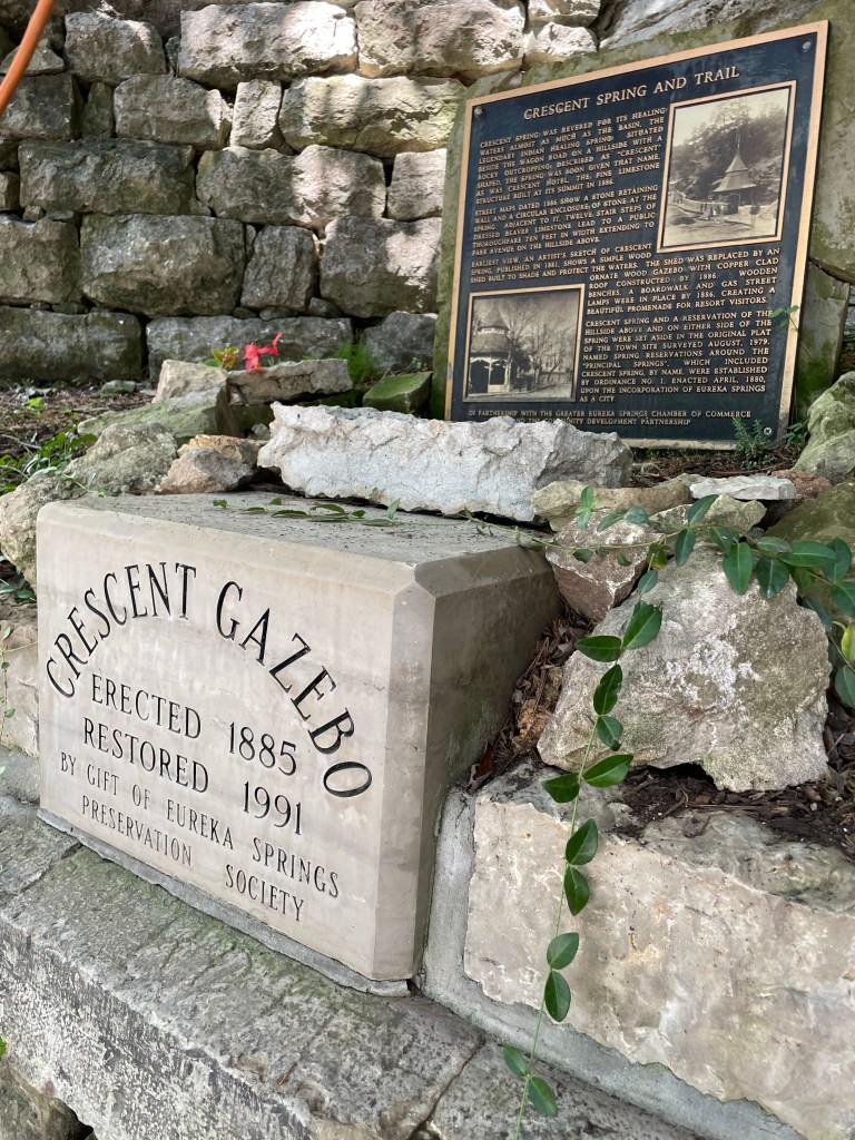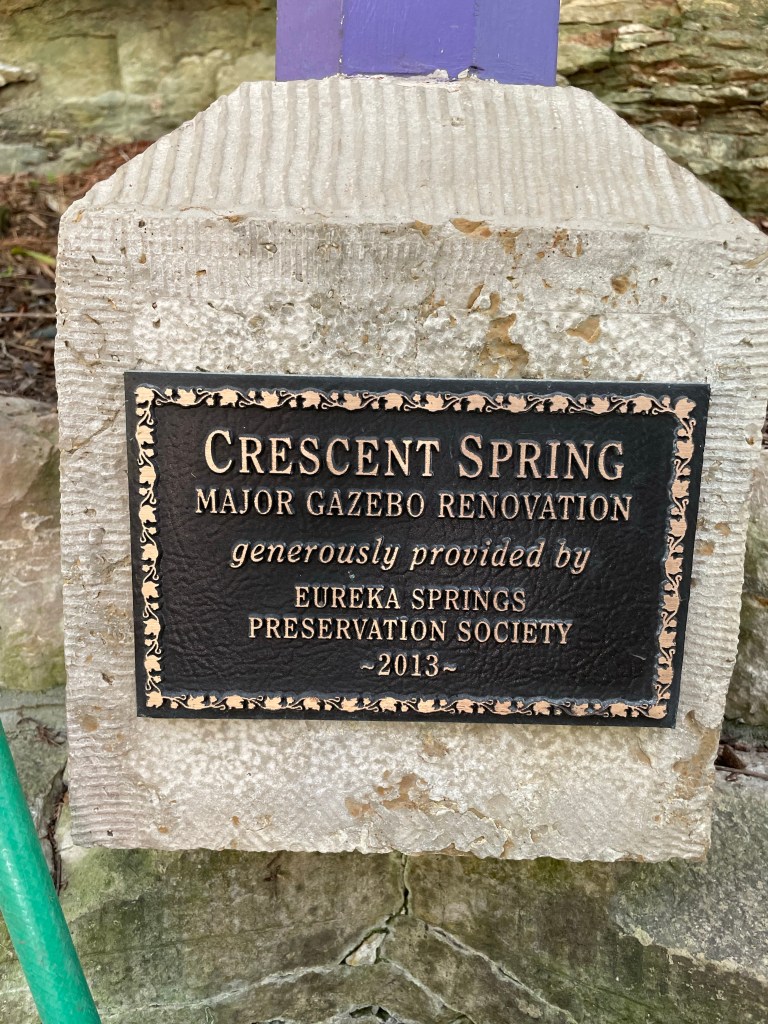 Crescent Spring is the next stop on our tour of Eureka’s spring reservations, set aside for public benefit early in the city’s history. This is the one for which Crescent Hotel is named, and you can still climb the stone steps up the hill to see that stately castle in the Ozarks. The current gazebo replaced the original one many decades after it had fallen into disrepair, and for many years was white with sage green trim. The current purple-and-aqua color scheme was applied in 2013 during a renovation. It features a copper roof, which has acquired a natural patina.
