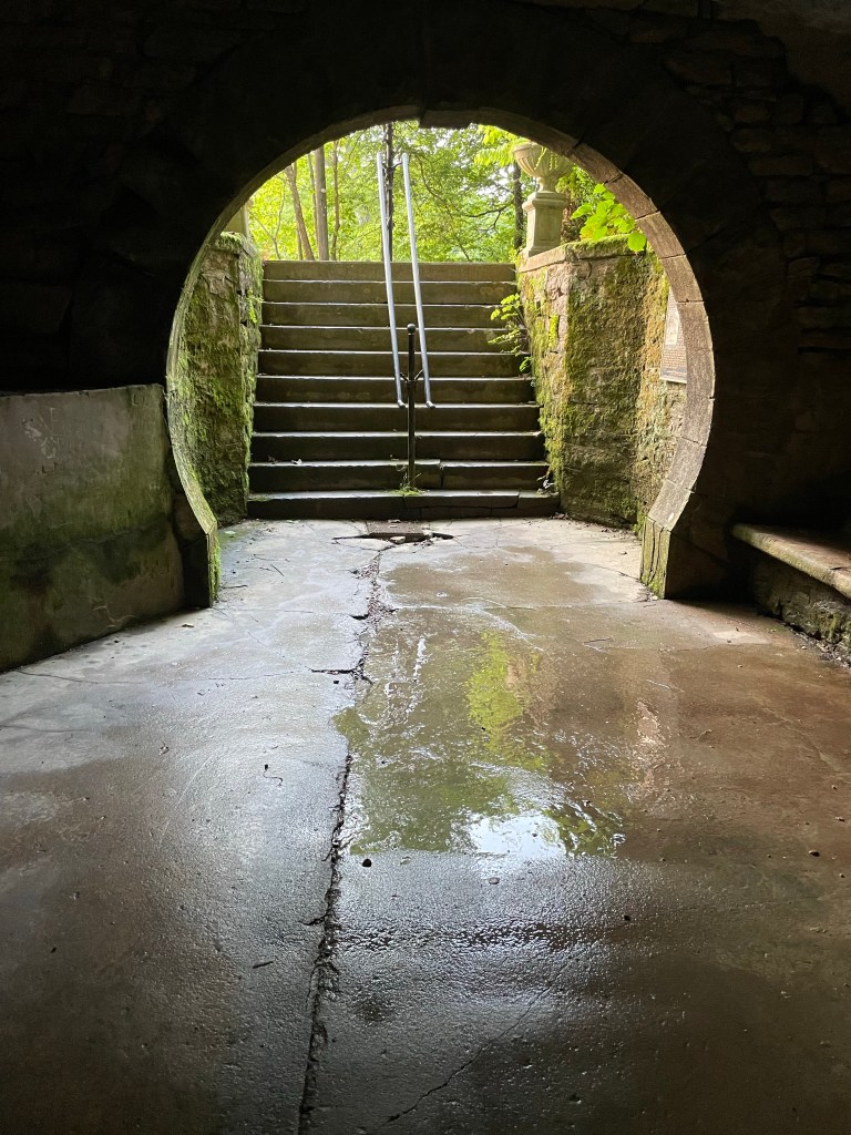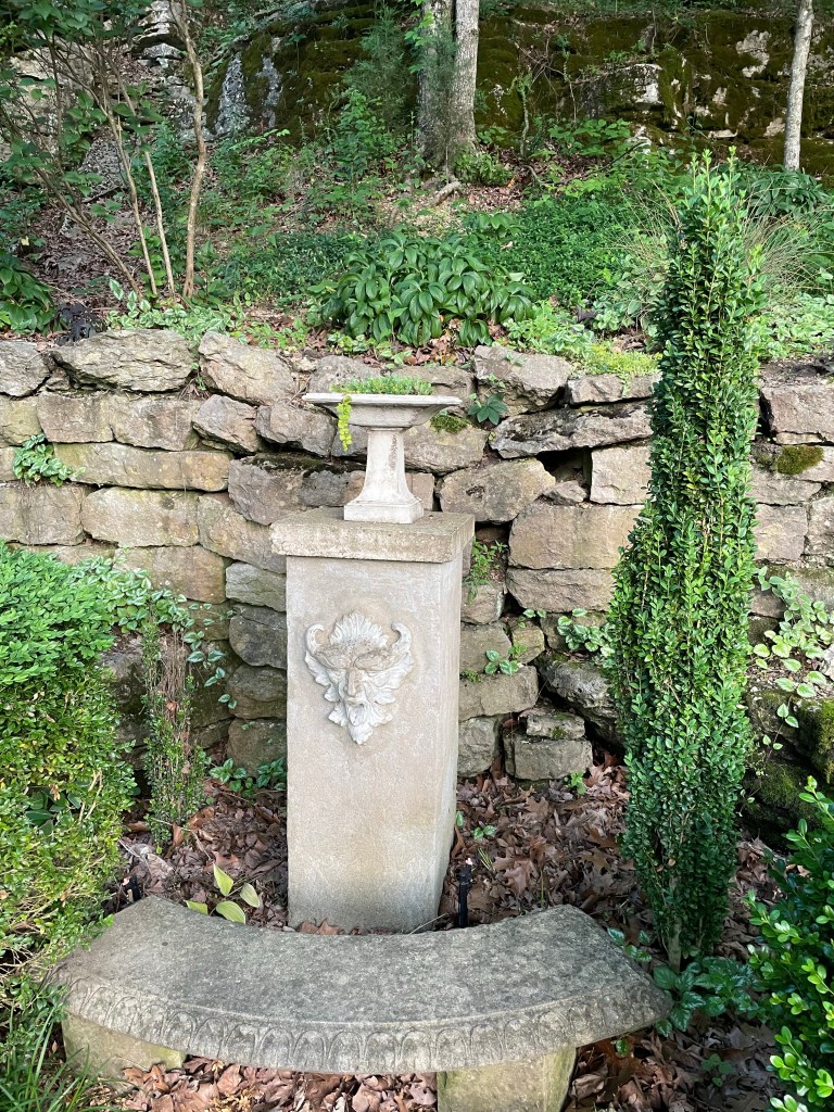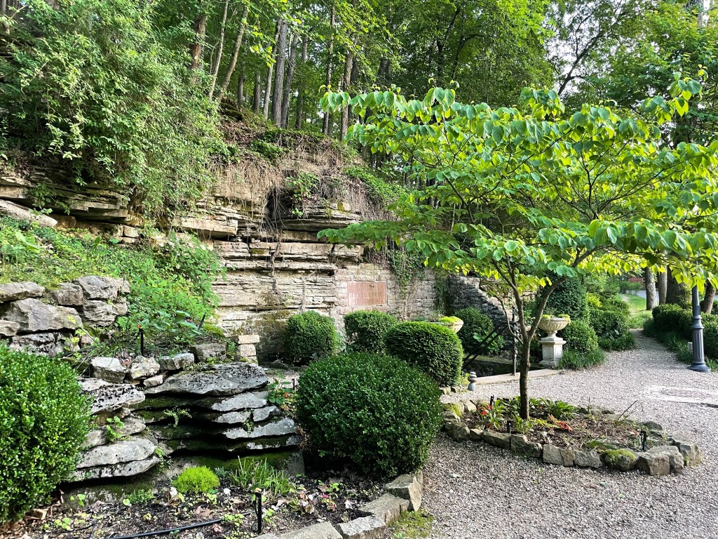 Crescent Spring gazebo hides behind trees as you approach it.But the reveal is entrancing.Historical marker records a capsule of the spring’s history.A stone marker complements the plaque.One of the pillars’ foundations recalls the gazebo renovation ten years ago.