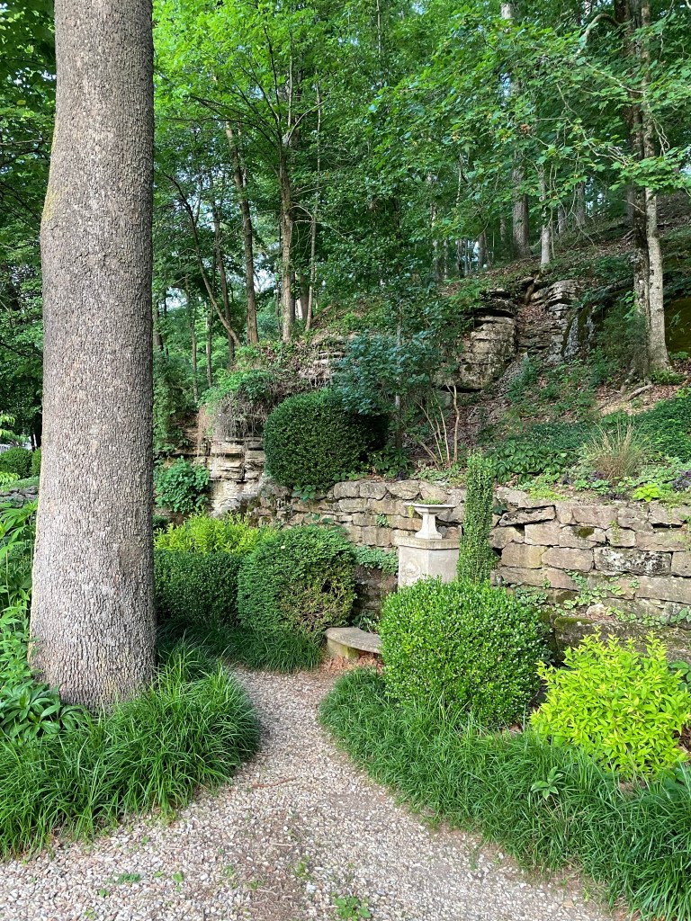 Carrie Nation’s “Hatchet Hall” as you approach on Steele Street.The spring, approaching from the south.The gated spring entrance, almost obscured by a tree.Please be courteous if you visit. (Photo taken from the street, zoom lens.)Hatchet Hall was also once home to local artist-legends Louis and Elsie Freund. They were the drivers of the visual arts movement in Eureka Springs. A mural of the town that they painted inside this home has been removed and preserved in the Eureka Springs Historical Museum.