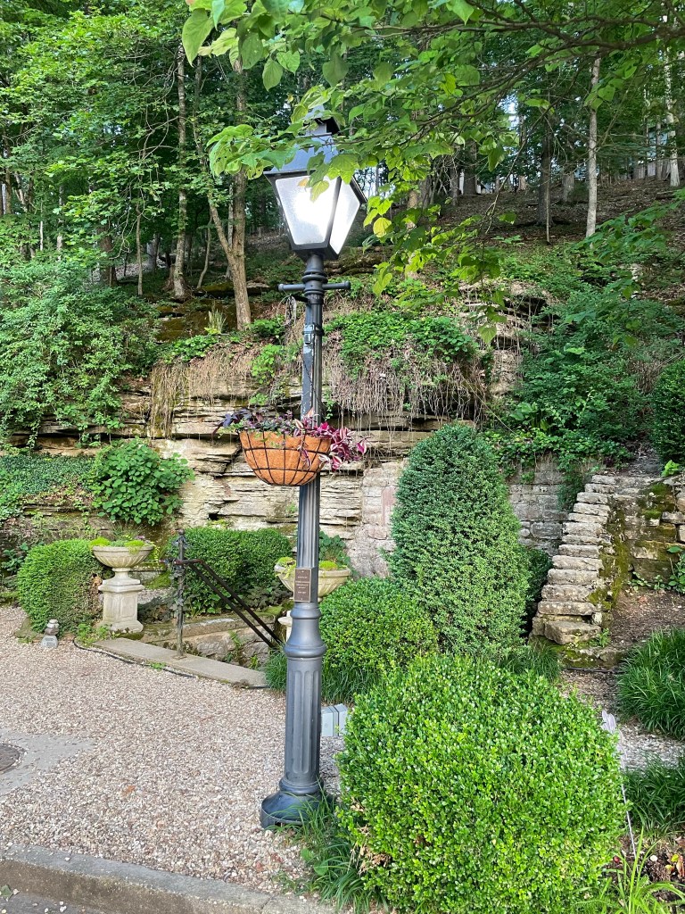 Approaching from the east.Grotto Spring is beautifully landscaped, like all the spring reservations. The arch and steps down to the springI have no idea who the keeper of the candle might be.The arch from the inside.Approaching from the west.A vintage -looking lamppost illuminates the reservation at night, matching those at other springs.A small bench and column on the west side. There is a concrete picnic table and benches on the east side, a feature common to many of the spring reservations.The view across the street from the spring at dusk.